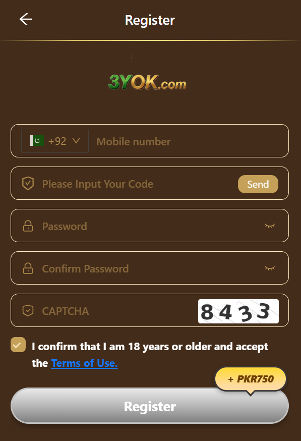 - Launch 3YOK Game and tap the register button to create your new account.