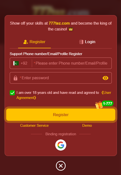 - Launch 777tez Game and tap the register button to create your account.